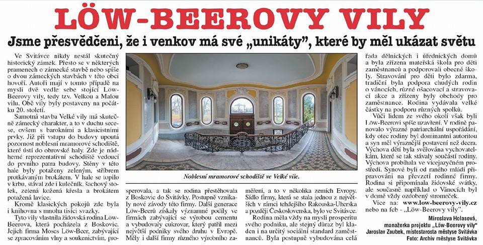 | 27. srpna 2014 | Svitávečtí zvou na slavnostní završení projektu propagujícího Löw-Beerovy vily Poslední prázdninovou sobotu proběhne ve Svitávce slavnostní ukončení projektu Löw-Beerovy vily, který měl za cíl zvýšit povědomí o těchto stavbách a představit je veřejnosti. Anna Dudková, Boskovicko regionální noviny |